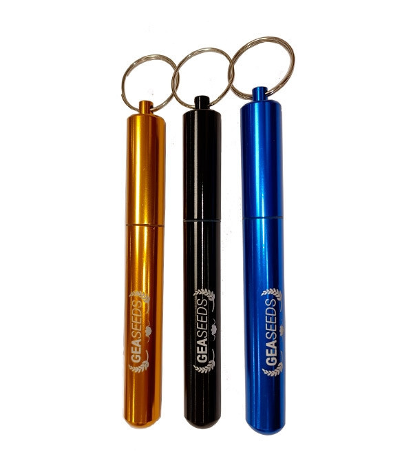 Kovové pouzdro na jointy nebo cigarety ve 2 částech, které se spojují závitem a těsnicím těsněním. K dispozici v různých barvách (červená, modrá, zlatá, hliník nebo černá) s kroužkem pro použití jako klíčenka.